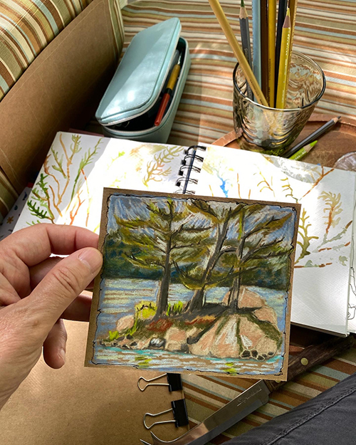 HELEN SIKSEK - FISH POINT STUDIO (mixed media)Gore Bay, ON Helen Siksek was born an artist and has been nurturing her creative spirit since the age of three. She identifies as an expressive, intuitive abstract painter. She paints unique original compositions through mark-making and experimentation. Preferring to paint outdoors, always close to the land and water. The best way to explore Manitoulin Island, the La Cloche region, Killarney Provincial Park and Lake Superior north shore is with fellow artists who share the same passion for painting in nature. Helen lives in Kagawong and is an avid plein air painter. She is inspired by Northern Ontario's landscape which to her includes vital invisible elements, wind, sunlight and vibrational energy from living beings and trees. She observes and paints with all her senses. Helen frequently begins a painting outdoors by the lake, and tries to stay true to the on-site observational experience for as long as she can, but when the bugs start to swarm, she and the painting run for cover. The painting is then developed and finalized in the comfort of her studio. Realism always influences the first pass of a painting, but her work rarely develops in a representational or traditional manner. Paying attention to energy and vibrancy is this artist's idea of fun when she creates abstract compositions. Especially when organic, abstract mark-making is given free-reign. Painting with abandon can be a tremendously gratifying energetic process. 'The final style and 'look' of the paintings always comes as a surprise to me', says Helen. Yet the shapes and colours emulate the real rocks, pebbles, shallow waters and sunlit reflections that inspire the beginning of a painting. Using this unique technique, reality and creativity become co-designers of the final product. Helen has served several arts organizations on the island including former leadership positions in the MFAA (Vice President, Art Tour Coordinator and NOAA rep), 4elements Living Arts (Workshop instructor and board member), La Cloche Art Show (Volunteer and Juror), and established the Manitoulin Plein Air Festival and the Manitoulin Island Artists Guild. Serving the arts on the island is what makes her happy. She is involved in other art endeavours including Studio 6 in Gore Bay and Artisans By the Bay in Kagawong. She organizes summer art festivals with her friends and tries to fit in one or two road trips a year. Helen spends the winter hibernating. To read more about Helen's latest collection of paintings, you are invited to follow her journey on her social media accounts:
